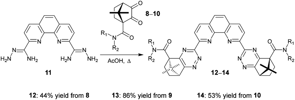 We next explored the synthesis of novel ligands by condensation reactions of diketones 8–10 with the known bis-amidrazone 11.8c Condensation reactions of 11 with diketones 8–10 in acetic acid cleanly gave the novel ligands 12–14 in moderate yields (Scheme 2). Use of ethanol or 1,4-dioxane as solvents resulted in incomplete conversion to the products.
