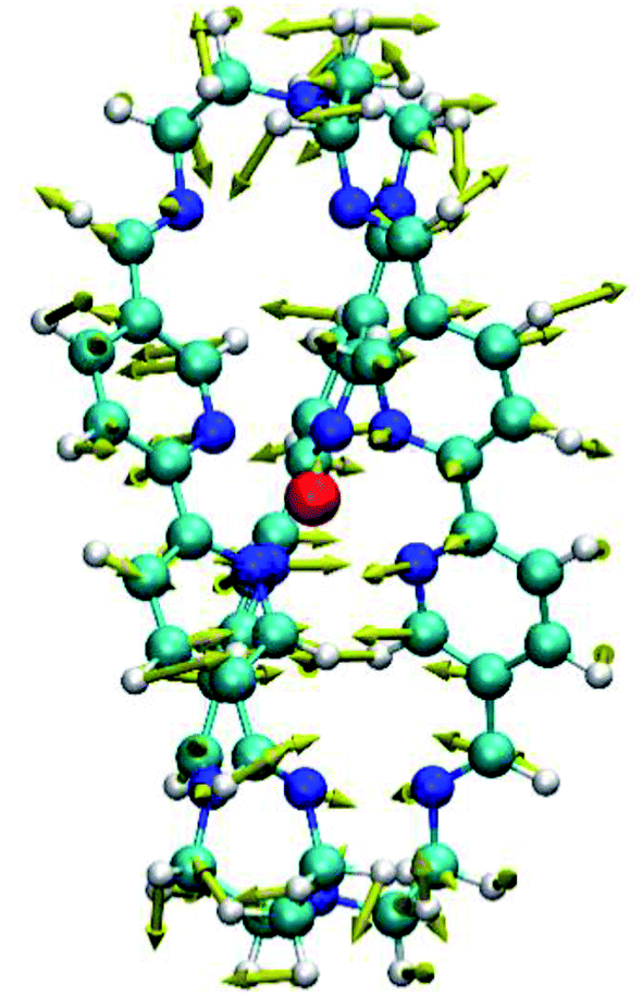 Fig. 6 DFT-based vector displacement diagram of the 154 cm−1 mode identified from the LPSVD analysis of the data plotted in Fig. 5. The large-amplitude motion of the ligand framework evident above and below the Fe(II) coordination site (red) was targeted for chemical modification via binding to Cu(I). |