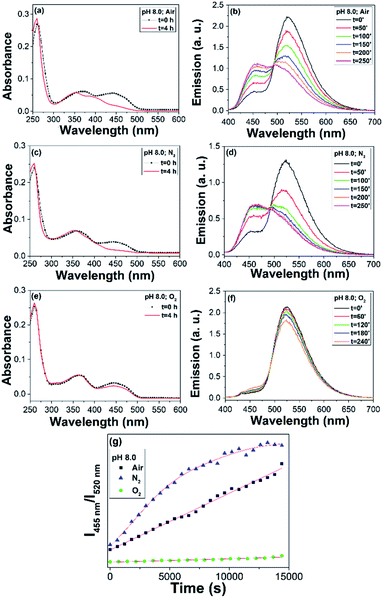 | | Fig. 3 (a) Absorption and (b) emission spectra (λexc = 390 nm) of AuNC@FAD in water and air atmosphere at pH 8 before (in black) and after (in red) irradiation under laboratory light. (c) Absorption and (d) emission spectra (λexc = 390 nm) of AuNC@FAD in water and N2 atmosphere at pH 8 before (in black) and after (in red) irradiation under laboratory light. (e) Absorption and (f) emission spectra (λexc = 390 nm) of AuNC@FAD in water and O2 atmosphere at pH 8 before (in black) and after (in red) irradiation under laboratory light. (g) Comparison between the ratiometric response (I455 nm/I520 nm) vs. time of the AuNC@FAD at pH 8 in air (in black), in N2 (in blue) and in O2 (in green) over 4 hours. | |