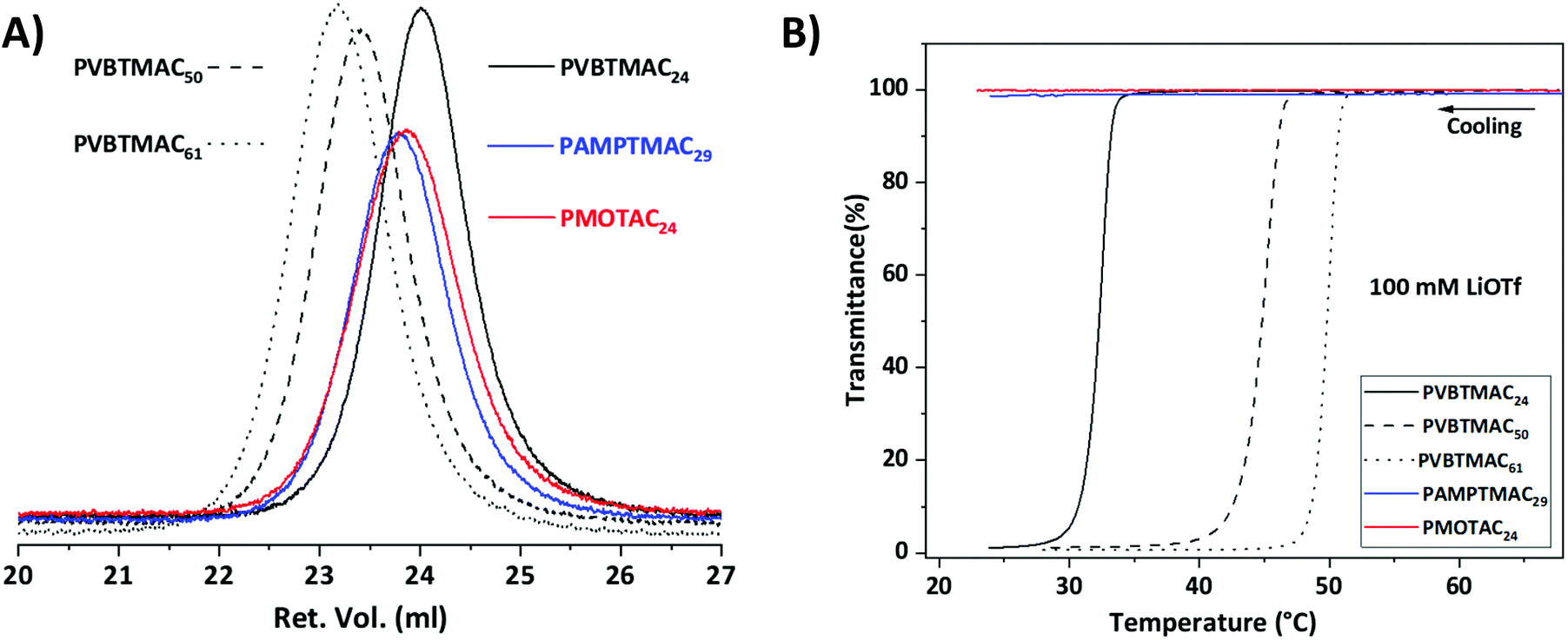 The degrees of polymerization and molar masses of the pure polymers were determined with NMR and SEC, see Table 1. In the NMR analysis, methyl proton peaks (3H, –CH3 around 1 ppm) from CPA were used as a reference to determine the final DP of PVBTMAC and PAMPTMAC macroCTAs. In the case of PMOTAC macroCTA the proton peak at 2.25 ppm from CCPA was used to calculate the DP (1H NMR spectra of macroCTAs are shown in Fig. S1†). The DPs of PVBTMAC macroCTAs from the end group analysis are 24, 50 and 61, which are close to the theoretical ones. A shift in the retention volume distributions agree with the increasing molar mass of macroCTAs. However, broadening of the molar mass distributions with increasing DP of PVBTMAC indicates poor control in the polymerizations. The polydispersity indices of the polymers are shown in Table 1, see also SEC eluograms in Fig. 1A. Broad molar mass distributions were also observed in the other two macroCTAs synthesized with target DP 30. We assume strong charge repulsions along the polymer backbone might have led to either a poor control of polymerizations or a poor separation in SEC.53 The final DPs and molar masses from NMR were used when conducting the dispersion polymerizations of DAAM.