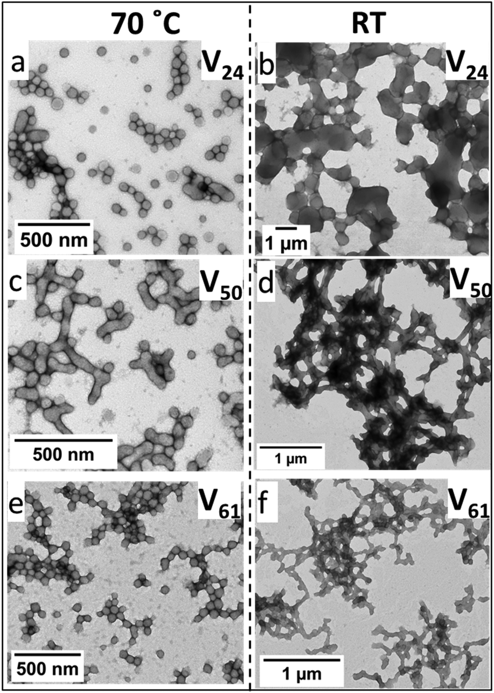 Next, polymerizations were conducted in aqueous LiOTf solutions at 70 °C. Using ionic ratio [LiOTf]/[Cp] 1, fused spherical structures were obtained in the dispersions of Vn-D500. Upon cooling to room temperature, the Vn-D500 particles fused together or even built worm-like networks. Increasing the solids content, the particle morphology changed to vesicles in case of the short styrenic CTA, V24-D500. The morphological changes were mainly due to the changing solubility of the styrenic polycations in the presence of LiOTf. In the case of more hydrophilic macroCTAs, no changes in the morphologies were observed.
