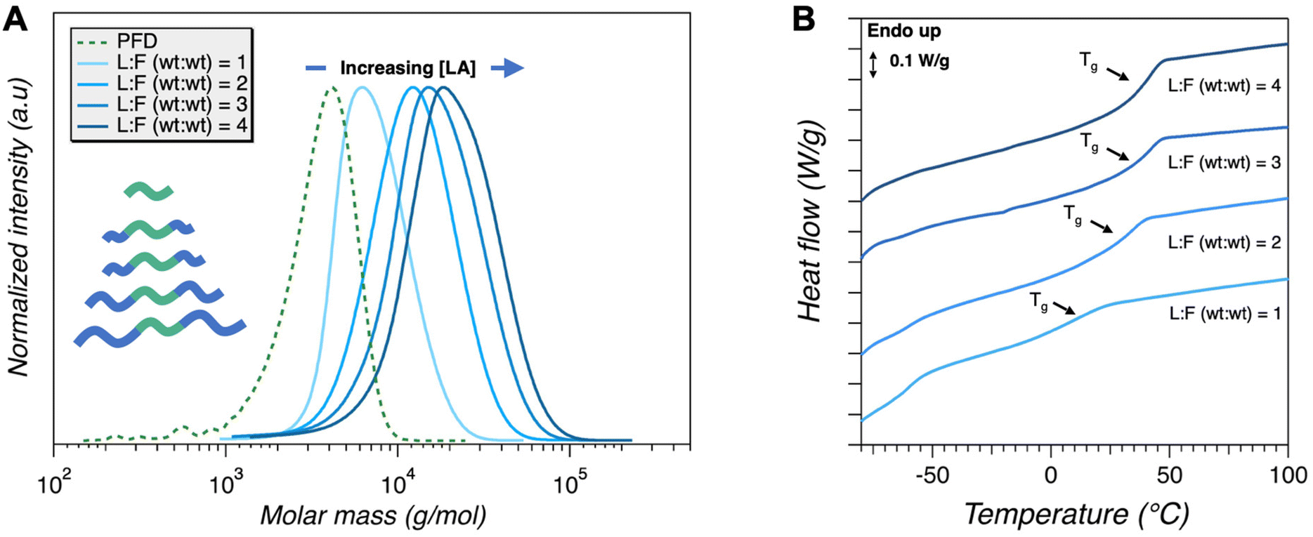 Finally, DSC was performed on the different triblock copolymers (Fig. 6B). An unambiguous increase of the Tg of the PLA component is observed as L