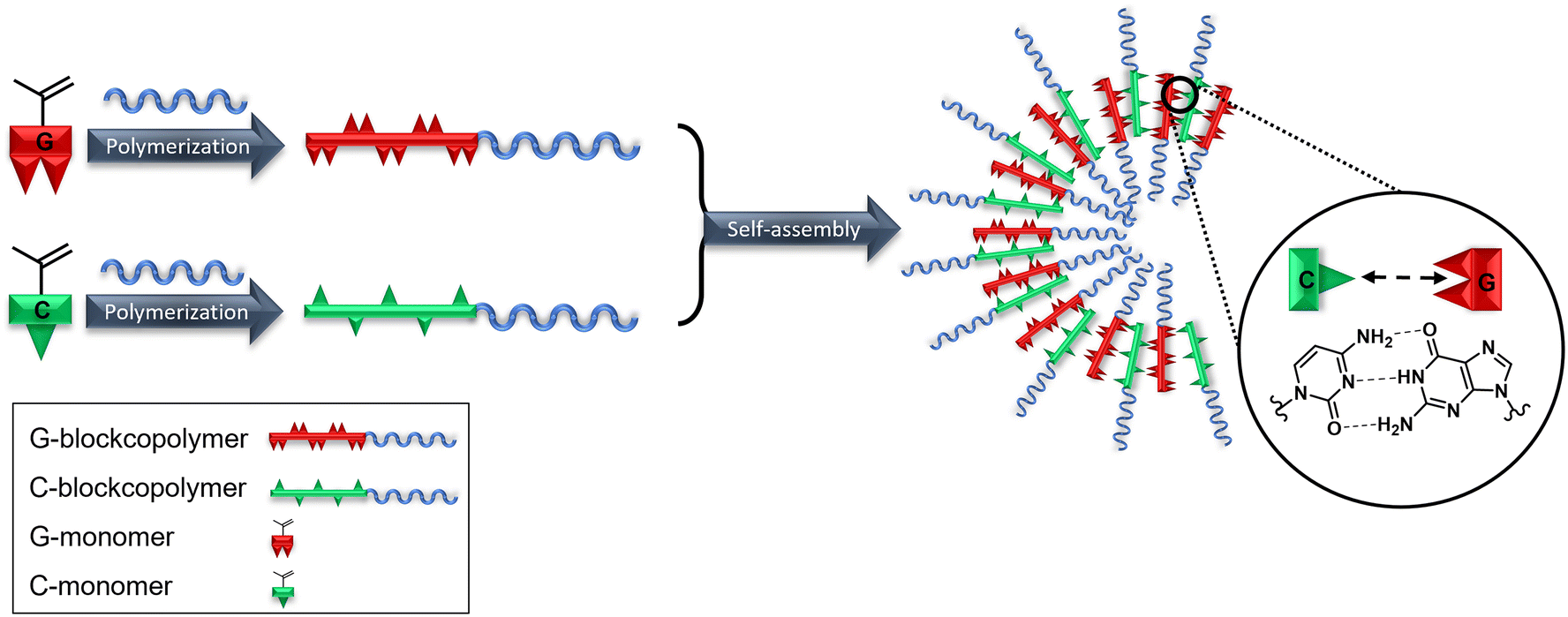 The base pairing property and the “melting” behavior of oligonucleotides can take advantage to develop new smart thermoresponsive and programmable materials. Complementary cytidine- (C) and guanosine- (G) based monomers were blockcopolymerized using RAFT polymerization technique with poly-(N-(2-hydroxypropyl) methacrylamide) (pHPMA) as the hydrophilic macro chain transfer agent (macro-CTA). C–C, G–G and C–G hydrogen bond interactions of blockcopolymers with respectively C and G moieties have been investigated using SEM, DLS and UV-Vis. Mixing and heating both complementary copolymers resulted in reforming new aggregates. Due to the ribose moiety of the isolated nucleoside-bearing blockcopolymers, the polarity is increased for better solubility. Self-assembly investigations of these bioinspired compounds are the crucial basis for the development of potential future drug delivery systems.
