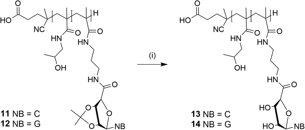 | Scheme 4 Acidic deprotection of the acetonide functional group of pHPMA-b-piCPMA 11 and pHPMA-b-piGPMA 12: (i) TFA, H2O, rt, 2 h (11: 53%, 12: 81%). | ||