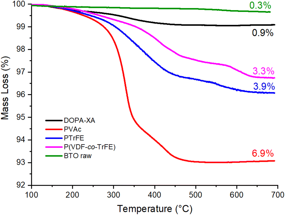 water binary mixture (90/10) and 100 mg of DOPA-XA were added, the mixture was stirred for 48 h at room temperature (20 °C). The resulting BTO-XA particles were then washed repeatedly via cycles of centrifugation–redispersion in acetone until complete disappearance of the DOPA-XA NMR signal in the supernatant solution. The particles were subjected to TGA to estimate the amount of DOPA-XA grafted on the BTO particles.