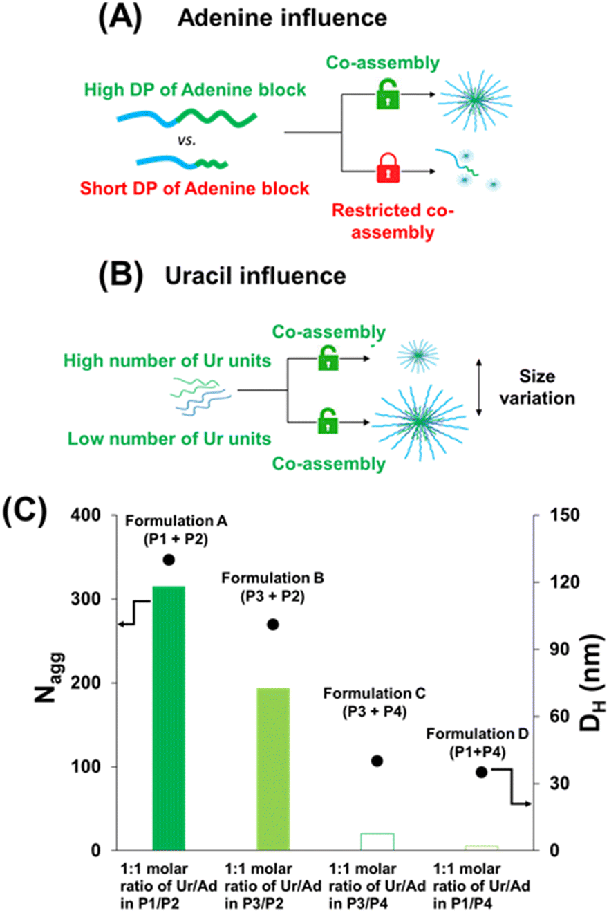 The effect of the length of the adenine-containing block and of the composition of the uracil containing polymer on the co-assembly was investigated. Four formulations (formulations A, B, C and D; Table 2 and Fig. 3) were compared. These formulations contained equimolar amounts of complementary nucleobases (ratio 1