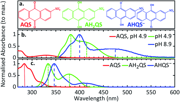 | | Fig. 7 (a) The structures of AQS and the species present at pH 4.9 and pH 8.9; (b) experimental UV/Vis spectra of AQS (0.1 M acetate buffer pH 4.9, 0.2 M KCl) and the electrochemically reduced species at different pH (0.1 M acetate buffer pH 4.9, 0.1 M PBS buffer pH 7.4, 0.1 M carbonate–bicarbonate buffer pH 8.9; 0.2 M KCl added in all solutions; ca. −0.65 V vs. SCE for 30 minutes before recording spectra); (c) the predicted UV/Vis spectra from the LC-ωPBE explicit solvent TDDFT theoretical spectroscopy with spectral warp corrections applied (see ESI 6†). The vertical lines in (b, c) denote the experimental and theoretical peak positions corresponding to each feature. Note: the two structures studied for the species present at pH 8.9 showed very similar UV/Vis spectra. | |