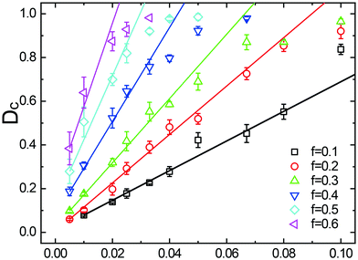 When analyzing the simulation results as shown in Fig. 3b, we can extract the NPD duty cycles at different values for the production rate I and driving force f. A large range of simulation parameters is summarized in Fig. 4, where the error bars depict the variation of Dc after removal of trivial translocation events (“renegade” particles which are detached from droplets). The linear relationship between Dc and I as predicted by eqn (6) is approximately satisfied (solid line), indicating that a variation of the NP-flow varies solely the frequency of droplet translocation but does not affect the average droplet size (Fig. 2). As long as the brush returns to its equilibrium state on a time scale covering the idle time between two subsequent droplets, Dc ∼ I holds in this parameter range. This is no longer the case as soon as the droplet frequency reaches sufficiently high values such that the waiting time between two droplets, Td − tp, approaches the relaxation time of the brush. The subsequent droplet then experiences a channel still being in the process of closure, and a further increase of NP-flow eventually enforces a continuously open channel.