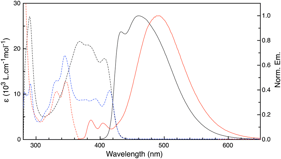 | a Degassed solutions (conc. = 10−6 M). b Total fluorescent quantum yield (λex = 365 nm). c Assigned to LE contribution. d In ns. e Assigned to EX contribution. f 50 μM solution. | ||||||