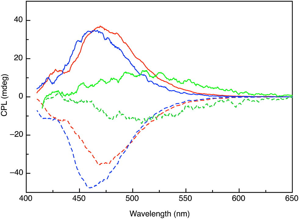 Efficient CPL originates from non- or partially-allowed electronic transitions according to the observation that it benefits from increasing the magnetic vs. the electronic transition dipole moment.3,14 In pyrene and pyrene excimers, the lowest-energy radiative transition is symmetry forbidden or possesses a small nuclear overlap integral.15 One may thus expect that, compared to excimers, charge-separated systems may favor CPL by increasing the spin/charge transfer character of the radiative transition.14 Indeed, CPL emission from a solution-based chiral exciplex system has recently been reported,16 and a significant enhancement in CPL emission from a helicene construct featuring a donor–acceptor pair was observed.17