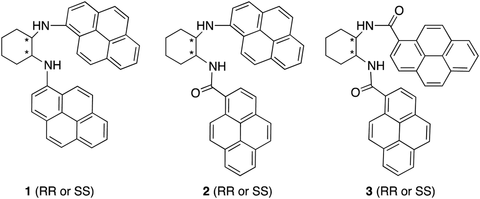 In addition to readily forming excimers, pyrene derivatives may form emissive exciplexes with charge transfer (CT) character in the presence of various electron donor or acceptor molecules. We thus surmised that small modifications of the redox potential in chiral, pyrene-based bichromophoric systems would lead to CPL from an intramolecular CT state. 1-Aminopyrene is a promising candidate that readily forms CT species because of its high-lying HOMO and H-bonding interactions.18Trans-1,2-diaminocyclohexane was selected as a chiral platform in view of its ready availability and widespread use in bichromophoric CPL emitters.12,13b,19