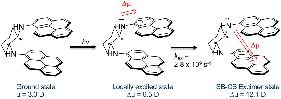 Trans-1,2-di(1-pyrenylamino)cycloxexane was found to display circularly polarized excimer emission (glum = 0.016) both in polar and non-polar solvents that is assigned to charge separation symmetry breaking on the basis of its large transition state dipole moment (12.1 D).