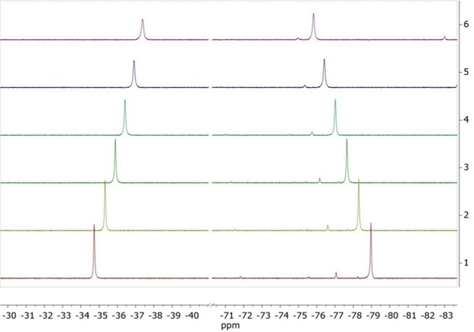 Fig. 4 Variable-temperature 19F NMR spectra of TmL1 in D2O. The temperature range was chosen as 298 K to 323 K. 1: T = 298 K, 2: T = 303 K, 3: T = 308 K, 4: T = 313 K, 5: T = 318 K and 6: T = 323 K. |