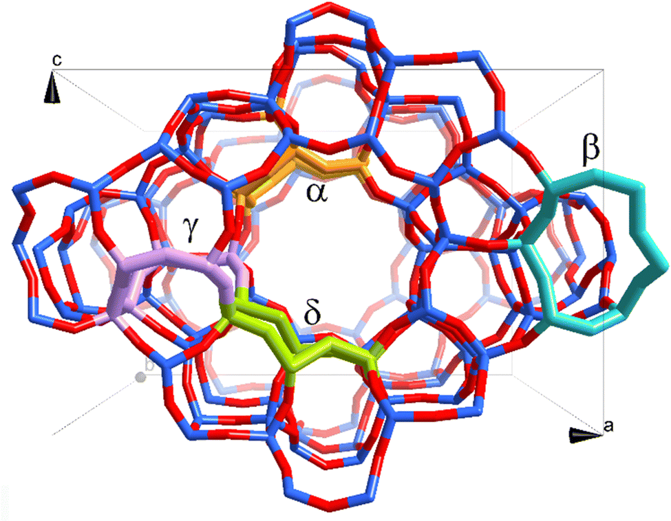 Fig. 1 shows the topology of the ZSM-5 framework. Four different locations of α-, β-, γ-, and δ-sites were selected for accommodating the active site, with α- and γ-sites being inside the main channel and zigzag channel, and β- and δ-sites at the intersection between the main and zigzag channels, respectively. The active site is a binuclear Mo2C2 molybdenum carbide cluster charge compensated by two Al sites at each location. This cluster was predicted to be the relevant species for MDA reaction by our previous work. For each location, the aforementioned two reaction pathways, i.e., ethylene and hydrocarbon pool routes, were examined.
