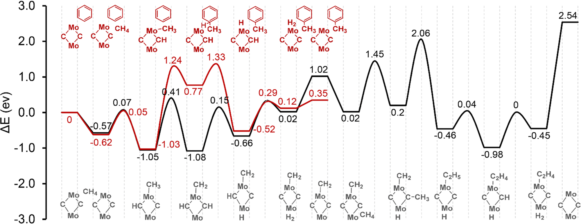 Methane adsorption over the β-site becomes endothermic (0.08 eV) when the benzene molecule is present adjacent to the Mo2C2 site. The C–H bond dissociation needs to overcome a barrier of 0.63 eV. The next step of benzene methylation to form the C7H9˙ compound needs to overcome a barrier of 2.35 eV. The reaction energy for this step is 1.3 eV. Dehydrogenation of the C7H9 compound has a barrier of 0.61 eV and a reaction energy of 1.37 eV. Formation of the H2 molecule is relatively straightforward. The barrier for H atom shifting from the C to Mo site is 0.93 eV, while the desorption of the so-formed H2 is thermodynamically favorable.