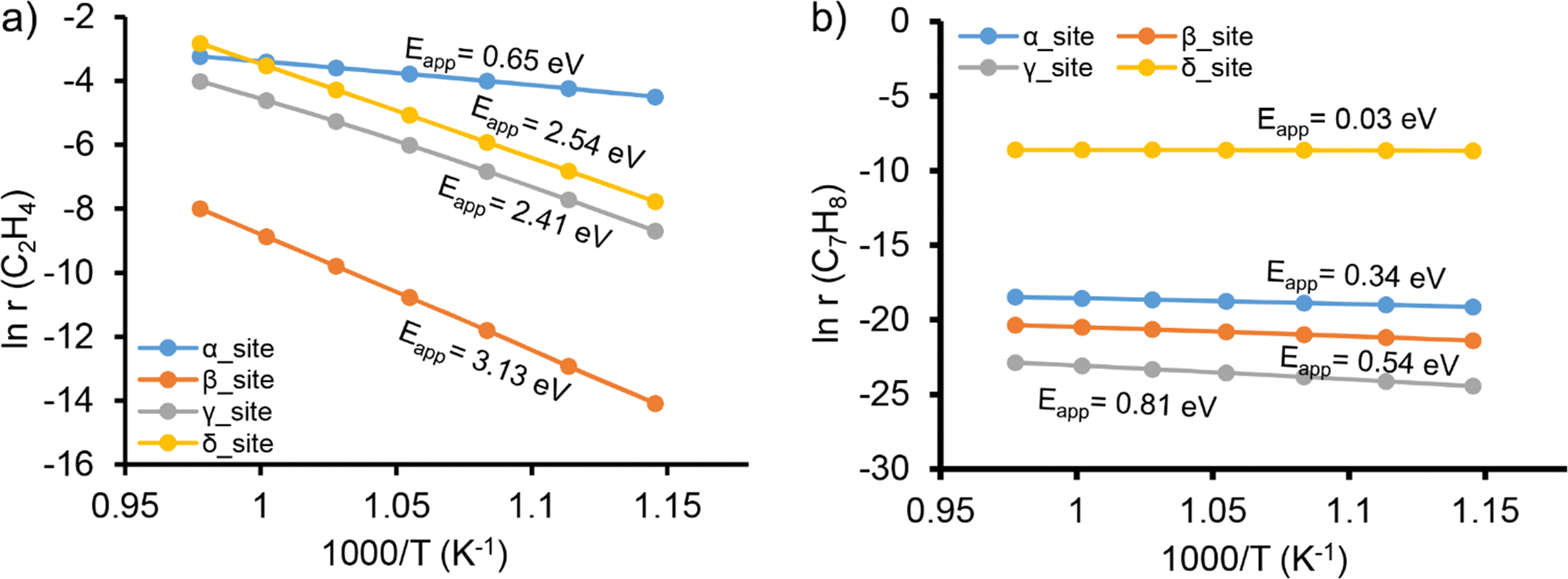 The MKM results of the hydrocarbon pool reaction pathway are illustrated in Fig. 3b and Fig. S7 (ESI†). Following this mechanism, it is identified that the δ-site is the most preferred location. For all sites evaluated, the apparent activation barriers along the hydrocarbon pool reaction pathway are much lower than the pathway of ethylene formation. Subsequent DRC analysis shows that benzene methylation to C7H9˙ is the main rate-determining step over the β-, δ-, and γ-sites, while over the α-site, the C7H9˙ dehydrogenation step turns out to have a more significant influence on the overall reaction rate. These results indicate the high degree of heterogeneity of MDA reactions taking place in Mo/ZSM-5.