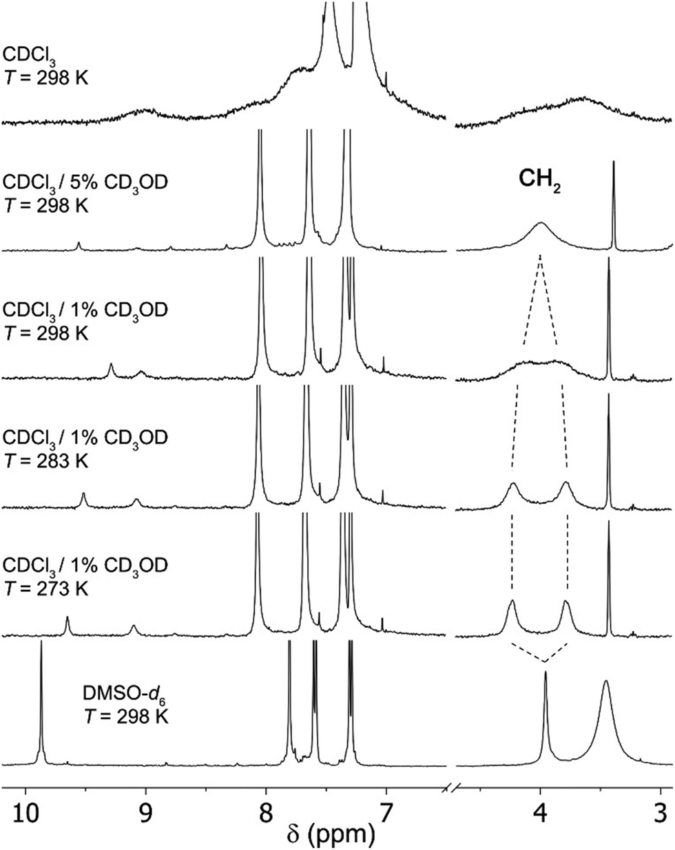 The 1H NMR spectra in CDCl3 of cavitand 1 at 298 K presents broad and poorly defined signals, indicative of mixtures of multiple slowly interconverting conformers and/or aggregation phenomena (Fig. 2). Upon addition of CD3OD into the solution (5% by volume), the resonances became sharper and well-defined, suggesting that intermolecular hydrogen bonding with methanol molecules is stabilizing monomeric cavitand species in a well-defined cone conformer. Nonetheless, this stabilizing effect is not sufficient to slow down the bowl inversion motion of the calix[5]arene core, as indicated by the appearance of the methylene bridge protons as a single resonance, rather than an AB system of diastereotopic protons as observed for related systems that are in slow exchange (in the NMR time scale). 22-24 We reasoned that while the addition of methanol would effectively provide a stabilizing effect by bridging the amide moieties along the mid-section of the cavitand, the hydrogen-bond competitive nature of methanol could disrupt the lower-rim intermolecular network of phenol groups, resulting in two opposing effects. To diminish the interference of hydrogen bonding at the lower rim, the amount of methanol was reduced to 1%, and we observed a significant broadening of the CH2 resonance, close to the coalescence point. Ultimately, upon decreasing the temperature to 283 K, the CH2 protons resolved into two separated and well-defined peaks corresponding to the expected AB spin system. The overall spectrum is consistent with a structure of averaged C5v symmetry resulting from fast rotation of the upper anilide panels about the aryl-CO bond, relative to the NMR time scale (the CH protons of the calix[5]arene core appear as a single resonance). Albeit the intensity of the NH and OH resonances of the cavitand is diminished by exchange with deuterium from CD3OD, the downfield shift observed for these resonances is in good agreement with the formation of stabilizing cooperative hydrogen bond networks. For comparison, we next assessed the behaviour in solution of 5b, an analogue of 1 lacking the ability to establish a hydrogen bond network at the lower rim. In solution of CDCl3 with 1% CH3OH, the 1H NMR spectrum of 5b displays sharp and well-defined resonances commensurate with an averaged D5h symmetry (Fig. S1, ESI†). The methylene bridge protons appear as a single sharp resonance, indicating fast cone inversion in the NMR time scale. Upon cooling, the spectrum remained unaltered even at 273 K, indicating that hydrogen bonding to methanol molecules is insufficient to stabilize 5b in folded cone conformers. Overall, these data indicates that the stabilization of 1 arise from a cooperative effect of intermolecular hydrogen bonding along the amide region and intramolecular hydrogen bonding at the phenolic lower rim. To corroborate these findings, we assessed computationally the structure of 1 bridged by 5 methanol molecules using DFT (Fig. 3). A structure minimization in implicit CHCl3 as solvent converged to a folded structure with the envisaged arrangement of methanol molecules establishing an uninterrupted cyclic hydrogen bond network with the amide groups. This arrangement preserves the array of hydrogen bonds between phenol groups at the lower rim that is characteristic of calix[5]arenes. The cavitand defines a highly spherical cavity with a total buried volume of about 1000 Å3.29
