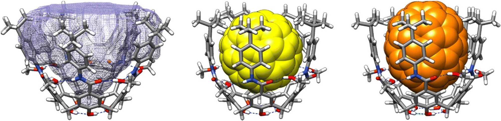 | Fig. 3 From left to right: optimized molecular models of 1·5(MeOH) (showing the available buried volume), C60⊂1·5(MeOH), and C70⊂1·5(MeOH). | ||