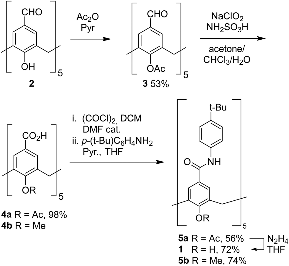 Cavitand 1 was synthesized by modifying our previously reported method with a suitable temporary protection scheme for the phenolic functions (Scheme 1). Calix[5]arene pentaaldehyde 224,26,27 was acetylated in moderate yield to obtain pentaacetate 3. The choice of protecting group is not trivial in this context, because groups larger than methyl impose significant barriers to the rotation of the aromatic panels about the methylene hinges of the calix[5]arene structure, leading to kinetically locked conformers that can hinder subsequent derivatization.28 Indeed, in the case of 3 a broad resonance is observed in the 1H NMR for the acetyl protons at 298 K. Nevertheless, this signal sharpened upon heating, making us confident that suitable conditions for subsequent derivatization could be found. Oxidation to the pentaacid derivative 4a proceeded uneventfully in excellent yield, and this precursor was then coupled with 4-(tert-butyl)aniline via the corresponding pentaacyl chloride in good yield considering the fivefold reaction. Finally, the acetyl groups of 5a were cleaved with hydrazine to obtain the targeted cavitand (1) in good yield. The O-permethylated analogue 5b was obtained in an analogous manner from pentaacid precursor 4b.