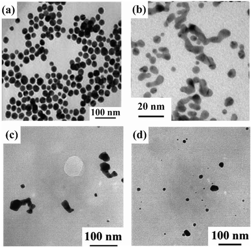 | | Fig. 1 TEM images of the mineralized Au nanostructures obtained using (a) A3, (b) Aβ25–35, and (c) and (d) R8-AuBP. (c) 10 μM R8-AuBP containing 0.5 mM HAuCl4 and (d) 1 μM R8-AuBP containing 0.5 mM HAuCl4. Modified and reproduced from ref. 33, 35 and 38 with permission, copyright 2005, 2018 and 2021, from Wiley-VCH GmbH, American Chemical Society and the Royal Society of Chemistry, respectively. | |