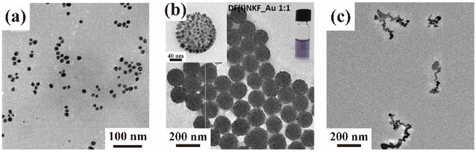 | | Fig. 2 (a)–(c) TEM images of mineralized Au nanostructures obtained using (a) AuBP1, (b) DF(I)NKF, and (c) RU006. Modified and reproduced from ref. 13, 44 and 43 with permission, copyright 2020, 2019 and 2014, from the Royal Society of Chemistry and American Chemical Society, respectively. | |