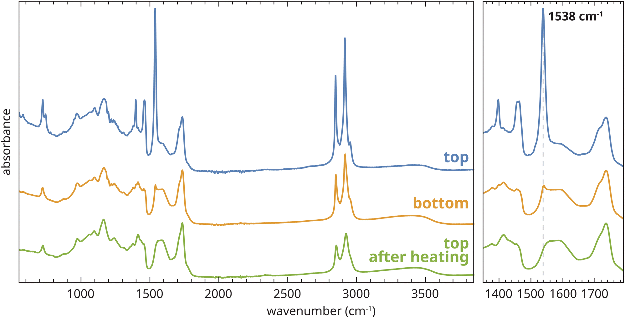 | Fig. 2 ATR-FTIR spectra collected on the top and bottom side of an aged zinc ionomer film based on linseed oil, and at the top side after heat treatment at 150 °C. | ||