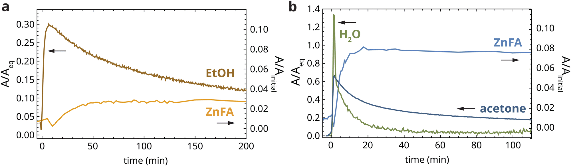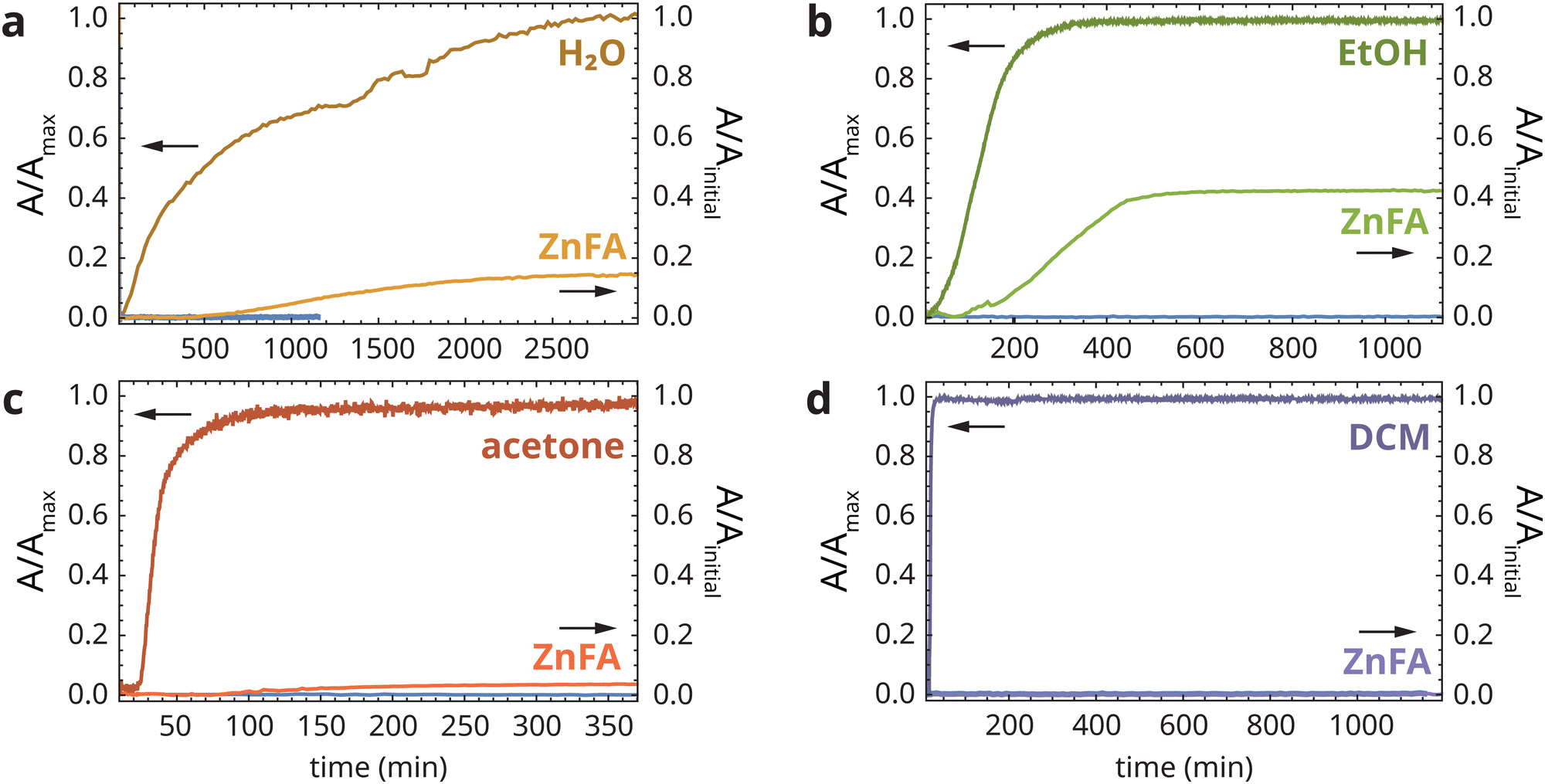ATR-FTIR spectra collected continuously during solvent exposure show the appearance of solvent vibration bands, a corresponding decrease in all bands associated with the polymer film due to swelling and, in some cases, the rise of crystalline ZnFA features (see Fig. S1, ESI†). Fig. 3 shows the normalized band area profiles for each of the solvents and crystalline ZnFA (normalization to the initial ZnFA band area prior to heat treatment). Section A.3 of the ESI† describes the data analysis procedure in detail. A comparison of ATR-FTIR spectra prior to heat-treatment, after heat-treatment and after solvent exposure is shown in Fig. S2 (ESI†).