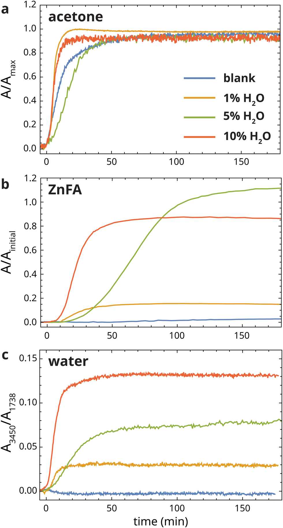 Comparing the ZnFA band area profiles in Fig. 4, it is immediately clear that the water concentration in acetone has a strong impact on ZnFA crystallization. Adding just 1% water to acetone already led to extensive crystallization of ZnFA up to 15% of the initial ZnFA band area prior to heat treatment. At 5% and 10% water, the crystalline ZnFA band area reached close to 100% within 100 min after the start of exposure. In all cases, crystallization started when the film was nearly completely swollen with solvent (i.e. when the acetone profiles approach a value of 1). In the run corresponding to 5% water, the final zinc soap band area was higher than before the heat treatment of the polymer. The cause for this effect is not clear, but we suspect there could be some diffusion of zinc ions and/or fatty acids into the measurement volume probed by ATR-FTIR in the course of the experiment, leading to minor changes in ZnFA concentrations. Additionally, the effect could be influenced by an overlap between the carbonyl bands of acetone and triglyceride ester, the latter of which is used for normalization prior to data analysis. Fig. S3 (ESI†) shows the comparison of the ATR-FTIR spectra before and after solvent exposure.