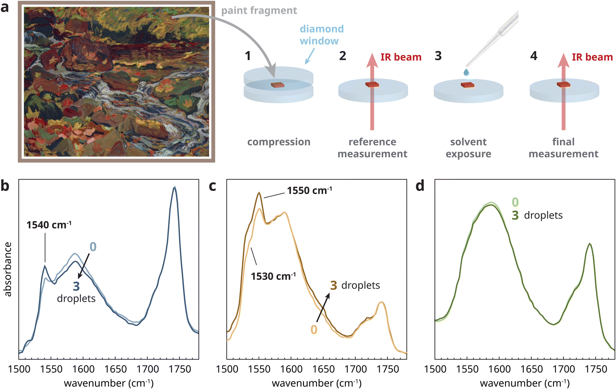 Moving closer to realistic conservation treatments, we showed that even exposure to only a few solvent droplets that contain 4–5% water can induce the formation of measurable quantities of crystalline zinc soaps. The strength of this accelerating effect is aided by the striking observation that solvent desorption is extremely slow, leading to solvent desorption lasting many hours even with exposure times of just a few minutes. Finally, we demonstrated an experimental method based on transmission FTIR microscopy to measure the chemical response to solvent exposure of minute real paint samples from artworks. Tests on three samples showed that solvent-induced zinc soap crystallization can also occur in real historic oil paint, though not all oil paints that contain zinc white reacted in the same way.