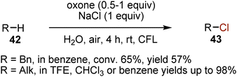 Higher conversions were demonstrated for oxone-mediated chlorinations with NaCl (Scheme 26).57 However, as electrophilic aromatic substitution could take place under these conditions, the solvent choice was crucial for the selectivity. This approach was successful for the chlorination of non-activated alkanes 42 as well. The role of oxone (2KHSO5·KHSO4·K2SO4) was to oxidize chloride to generate chlorine Cl2. Without light, the yields of the products 43 were not higher than 4%, showing the need for the irradiation.
