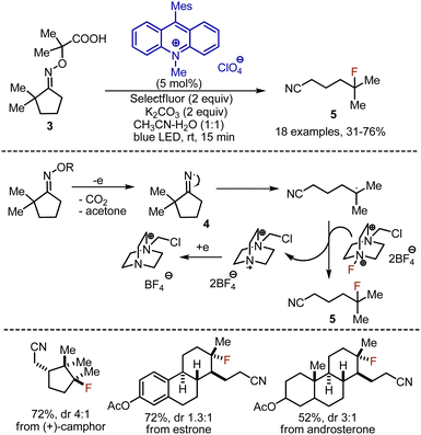 Distal fluorination via 1,5-hydrogen atom transfer (HAT) approaches has been developed for various compound classes.18 In 2018 Leonori et al. reported a cascade of oxidation-ring opening-fluorination reactions of oximes 3 under visible light-mediated conditions (Scheme 4).19 Acridinium salt was used as photocatalyst, which oxidised the carboxylic group into an oxime, leading to the release of CO2 and acetone. The thus formed iminyl radical 4 underwent ring opening reaction to give a nitrile moiety and a C-centered radical. The latter abstracted fluorine from Selectfluor, forming the product 5. The catalytic cycle was closed by single electron transfer (SET) reduction of a cation radical from Selectfluor with the reduced form of the acridinium catalyst. Short-lived radical chain propagation processes were found to be acting along with the photoredox pathway according to the quantum yield of the reaction measurements (Φ = 2.8). Oximes derived from cyclobutanones reacted smoothly, whereas oximes derived from cyclopentanones, cyclohexanones, and cycloheptanones required an aromatic substituent in the α-position to stabilize the resulting radical. Interestingly, various natural products, like (+)-camphor, estrone, androsterone, etc. could be used.