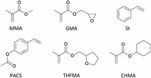 | Fig. 1 Chemical structures of monomers used in present work: GMA, St, PACS, THFMA and CHMA are classified as M1 and MMA as M2. | ||