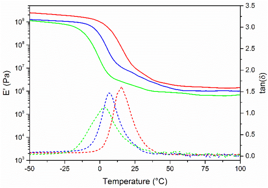 FPA-8, FPA-17 and FPA-25 were evaluated by dynamic mechanical analyses (Fig. 4). As expected, the Tα measured by DMA followed the same trend as the Tg measured by DSC: as the free amine group content increases, the chain mobility increases and the glassy/rubbery transition temperature decreases. Moreover, the storage modulus value slightly decreases with an increase of the free amine group content, as expected.