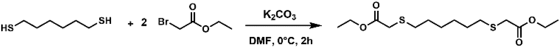 1H NMR (400 MHz, CDCl3): δ (ppm) 4.38 (q, 3J = 7.1 Hz, 4H, CH3–C2–O–CO), 2.89 (t, 3J = 7.4 Hz, 4H, S–C