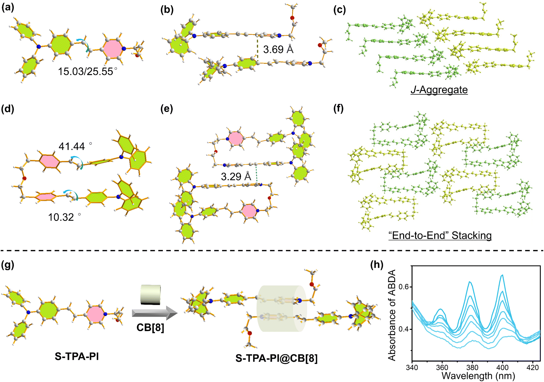 To further validate the above conclusion, an exploratory experiment was designed to change the stacking pattern of S-TPA-PI with cucurbit[8]uril (CB[8]), which could hold two pyridinium salts through host–guest interaction, formatting “end-to-end” stacking.44 As depicted in Fig. 3g, S-TPA-PI aggregates alone cannot generate ROS under white-light irradiation. However, when CB[8] was employed, signals of singlet oxygen were observed as shown in Fig. 3h, demonstrating the huge effect of modulating stacking patterns on photo-generated ROS.