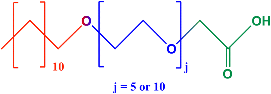 The aim of the present work is to investigate the effect of surfactant ionization on the thermoresponsiveness of the surfactant/CD supramolecular assemblies. We investigated the structural behaviour of the inclusion complexes assemblies between two alkyl ether carboxylic acids, the pentaoxyethylene dodecyl ether carboxylic acid (C12E5Ac) and the decaoxyethylene dodecyl ether carboxylic acid (C12E10Ac) (chemical structure in Fig. 1), with αCD and βCD by small-angle neutron scattering (SANS) over a wide temperature range of 15–70 °C. The temperature-induced phase transitions and thermodynamics were monitored by differential scanning calorimetry (DSC). We report the differences in the thermal responses of the structures resultant of the chemical architecture of surfactants, cyclodextrins, and the surfactant's degree of ionization, given as the sodium hydroxide and surfactant molar ratio (α = [NaOH]/[Stot]).