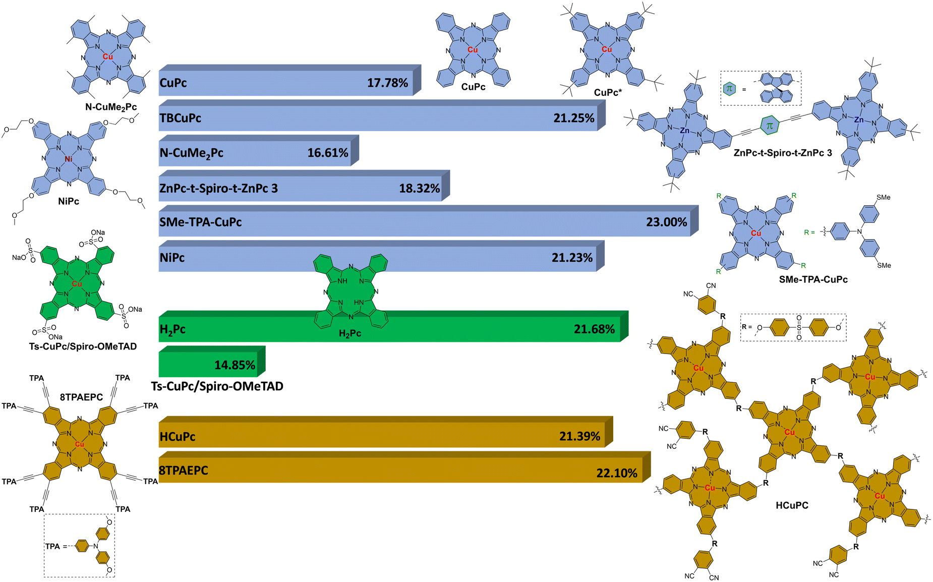 Table 1 Hole mobilities and HOMO levels of different unsubstituted and alkyl/aryl-substituted Pcs used as HTMs in n–i–p PSCs, along with perovskite composition, device configuration and performances under reverse scan of the best devices