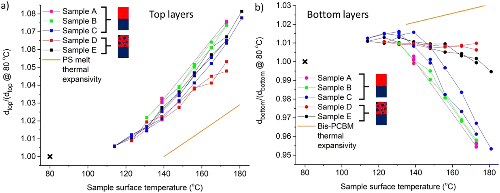 | Fig. 6 Reversible layer thickness changes during in situ thermal cycling of 5 different 300k PS/bis-PCBM bilayers following equilibration (samples A, B and C had pure PS top layers initially, and samples D and E had PS/bis-PCBM blend top layers initially). The plots show layer thickness as the temperature is cycled from high-to-low-to-high, and finally after cooling to 80 °C (marked by x). (a) Ratio of the thickness of the top (PS/bis-PCBM blend) layer during annealing, to the thickness of the top layer after cooling to 80 °C, versus sample temperature. The orange line in (a) represents the thermal expansivity of PS melt films from the literature (7.2 ± 2 × 10−4 K−1).37 (b) Ratio of the thickness of the bottom (pure bis-PCBM) layer to the thickness of the bottom layer after cooling to 80 °C, versus sample temperature. The orange line in (b) represents the thermal expansivity of bis-PCBM films (approximately 2 × 10−4 K−1 see ESI,† for details). | |