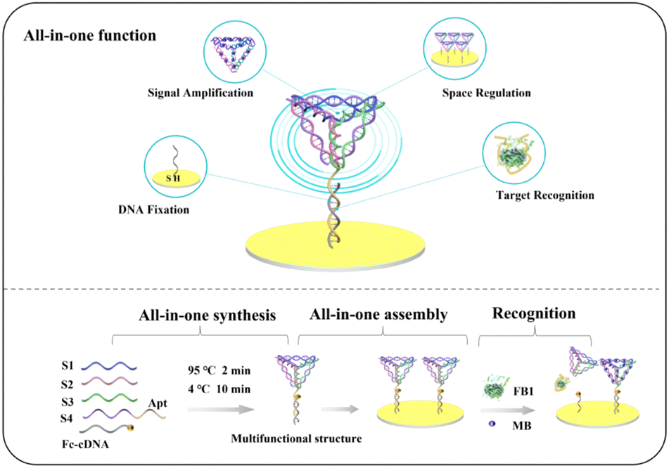 Here, we develop an all-in-one strategy for efficient assembly of an electrochemical aptasensor. A multifunctional structure based on a tetrahedral DNA nanostructure (TDN) was synthesized via a one-step annealing process, providing DNA fixation, target recognition, signal amplification and space regulation. Based on the integration of this multifunctional structure, the sensing interface was assembled in one step. A ratiometric aptasensor was constructed by anchoring methylene blue (MB) to the TDN and ferrocene (Fc) on the cDNA. Using the ratio of the currents obtained from Fc and MB as a measure, the developed aptasensor shows excellent analytical performance for fumonisin B1 detection. This strategy is universal and could simplify the fabrication of aptasensors.