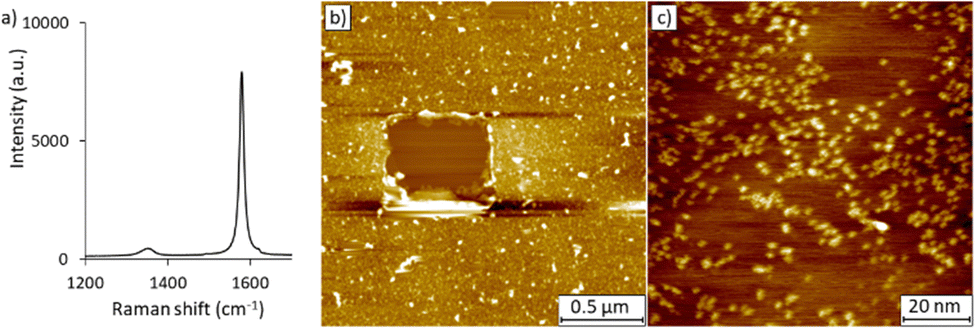 To get a clear description of the molecules attached to the surface, three different on-surface characterization techniques were performed: Raman spectroscopy, atomic force microscopy (AFM), and scanning tunneling microscopy (STM). From these techniques, Raman spectroscopy allows one to study the amount and the nature of the defects in a graphitic substrate.22,23 For graphitic materials, the main bands that are considered are the G band, which is characteristic of the sp2 carbons, and the D band, which is induced by the presence of defects. For covalently functionalized materials, the amount of defects generally increases due to the conversion of sp2 carbons to sp3 carbons in the grafting process. The insertion of defects can be observed by the presence of a D band in the Raman spectrum (Fig. 1a), which is not observable for pristine HOPG (Fig. S5, ESI†), and the corresponding increase in the ID/IG ratio to 0.041 ± 0.007.