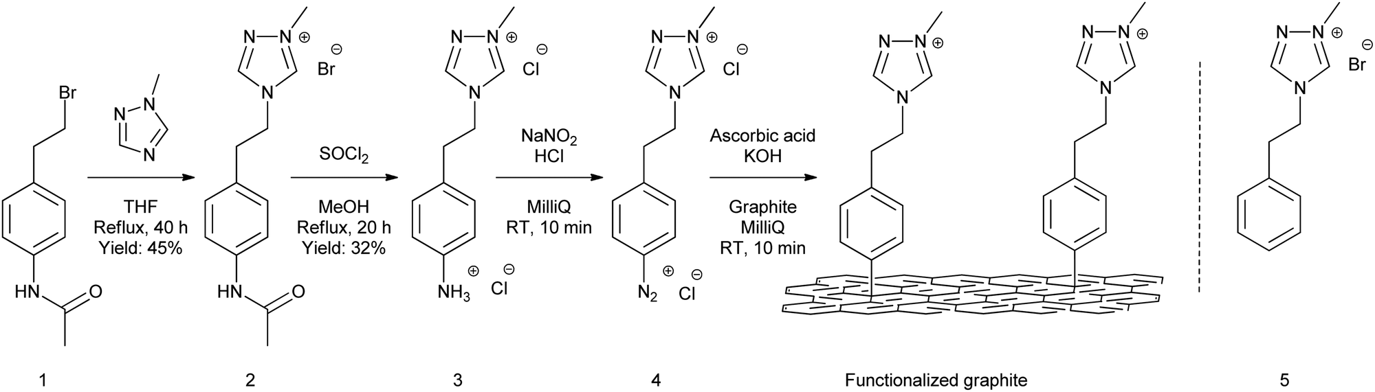To allow covalent attachment to a graphitic substrate, a suitable NHC-precursor should be designed. In this aspect, a linker containing an aniline moiety was added. The aniline moiety can be converted to a diazonium group, which is commonly used in grafting experiments. The synthesis of the molecule starts from N-[4-(2-bromoethyl)phenyl]-acetamide (1) which was synthesized following an adaptation of a previously reported procedure.18,19 Compound 1 was then reacted with 1-methyl-1,2,4-triazole to synthesize compound 2 and the amine group was deprotected to obtain product 3 (Scheme 1).20 The 1,2,4-triazolium NHC catalyst was chosen because of its abundant use in benzoin condensation.5 Additionally, compound 5 was synthesized to be used as a homogeneous catalyst for comparison with the supported catalyst.21
