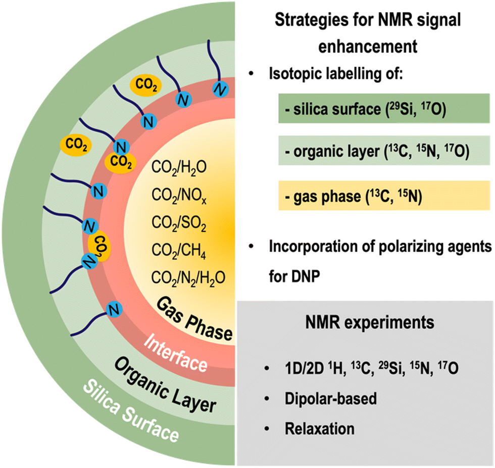 Developing the next-generation CO2 adsorbents relies on understanding how synthesis conditions impact the structural and textural properties of the sorbents, thereby influencing active adsorption sites at the atomic level. Achieving this requires the preparation of materials with control over the quantity and homogeneity of surface amine coverage. This aspect often implies performing grafting of organic moieties at a controllable intermolecular distance while maintaining the mesostructure. This approach addresses fundamental questions such as unravelling the role of silanol groups in CO2 speciation and uptake, identifying the optimal type of amine functional groups and the necessary degree of amine coverage for maximizing CO2 adsorption/selectivity. Moreover, it also helps to obtain atomic-level evidence about the benefits of cooperation between neighboring functional groups in CO2 speciation/uptake through a combination of ssNMR and computational methods. These methods allow structural elucidation of the CO2 species formed at confined surfaces at atomic resolution to be obtained. However, the bottleneck for future ground-breaking atomic level structural details on the CO2 adsorption mechanisms lies in the development of novel surface modification strategies targeted to boost the capabilities offered by NMR spectroscopy. The next section will provide insights on this subject.