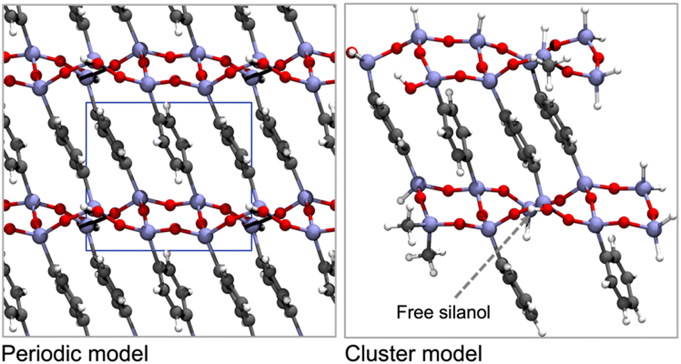 Cluster models are more affordable than periodic models, and their validation is fundamental to the computational study of the interaction of different gas molecules at the surface of PMO structures. Our group observed that both types of models,48,125 were accurate in the determination of CO2 and CH4 adsorption performances on Ph-PMO sorbents, as the obtained data agrees with the experimental adsorption measurements, regardless of the chosen DFT exchange–correlation functional (Table 3 and Fig. 8).