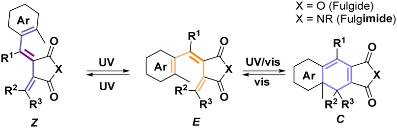 Fulgide photoswitches exist in three isomeric forms – two open isomers (historically denoted E and Z) and a closed isomer (C) (Scheme 1). Because of its geometry, Z cannot undergo photoinduced ring closing and is, therefore, denoted as an inactive form. Upon double bond isomerization in inactive form Z, the resulting active form E readily undergoes photoinduced electrocyclization, affording the closed form C of the fulgimide. Photoinduced isomerization between active and closed forms is accompanied by a distinctive color change.6,10 As such, photoswitching between E and C has been historically regarded as the key mode of action and double bond isomerization as an unwanted side reaction. But double bond isomerization, accompanied by a large structural change, may act as a lock, blocking photocyclization between E and C. By controlling these processes – initial Z to E double bond isomerization (activation), closing and opening between E and C and double bond isomerization back to Z (deactivation) – we can selectively control switching between all three fulgimide isomers (Scheme 3).