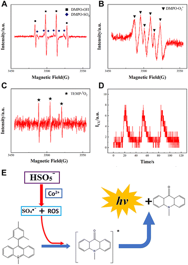 Fig. 8 ESR spectra of (A) OH˙/SO4˙, (B) O2˙ and (C) 1O2 in the Acr+–Mes/KHSO5 system. (D) CL intensity of the Acr+–Mes/H2O2 system. (D) CL intensity of the Acr+–Mes/H2O2 system. (E) CL mechanism of the Acr+–Mes/KHSO5 system and the detection of Co2+. [Acr+–Mes]: 0.1 mM; [KHSO5]: 2 mM; [H2O2]: 2 mM; [PBS]: 0.1 M, pH = 7.0. PMT voltage: −900 V. Reprinted with permission from ref. 15, Copyright 2023 American Chemical Society.