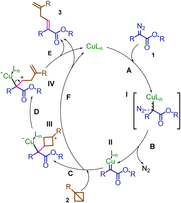 Based on our results and literature,13–18 a possible reaction pathway is proposed (Scheme 3). Initially, a copper carbene intermediate II was formed from the copper catalyst and diazo compound with the release of nitrogen. Then the BCB reacted with the copper carbene intermediate to give the final diene products.