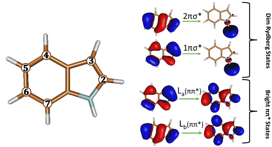 On the other hand, the dark Rydberg πσ* states (see Fig. 1) that lie above these ππ* states at absorption are found to play a vital role in quenching the fluorescence intensity.46,47,56 Gas phase computational studies have shown that excitation above the ππ* states promotes population to a Rydberg πσ* state. This Rydberg state dissociates along the N–H stretch coordinate and thus mediates N–H fission in indole and the ejection of a hydrogen atom or radiationless decay to the ground state.47,56 In solution, the polar solvent stabilizes the πσ* state such that it is now in close energetic proximity to the strongly emitting S1 (ππ*) state and forms a conical intersection (CI) with the electronic ground state S0.47,56 Radiationless decay via this S1 (πσ*)/S0 CI causes fluorescence quenching and a decrease in the fluorescence quantum yield as excited state hydrogen atom transfer (ESHT) from the NH group of indole to the hydrogen bonded (HB) solvent molecule takes place.46,47,56 Experimental and theoretical studies of indole and other aromatic chromophores with water clusters have found that ESHT and excited state proton transfer (ESPT) result in large emission Stokes's shift and are characterized by an ultrashort fluorescence lifetime.57 This acid–base photochemistry has also been observed in the parent probe tryptophan, other aromatic amino acids, and nucleic acids in polar protic solvents.39,58–63 Time resolved experiments have been performed to explore the dynamics in indole64,65 and microsolvated indole.66–68 The most recent ultrafast time resolved measurement on indole-(H2O)1 was able to capture the decay from the initially absorbed ππ* state to πσ* state and eventually to the ground state.68 The conversion from ππ* to πσ* happens in 445 fs while decay to the ground state was measured to be 13 ps.68