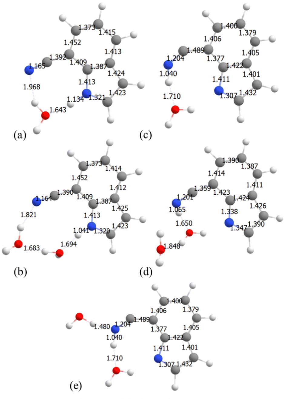 N– angle to become bent at a 141° angle, and the CNH substituent is loosely connected to the ring. On the other hand, in the 2H2O cluster, the C8-CN bond length of the 7-CNI probe decreases from 1.390 Å (Fig. 7(c)) to 1.359 Å (Fig. 7(d)) after H is transferred to the CN group which results in a near linear C