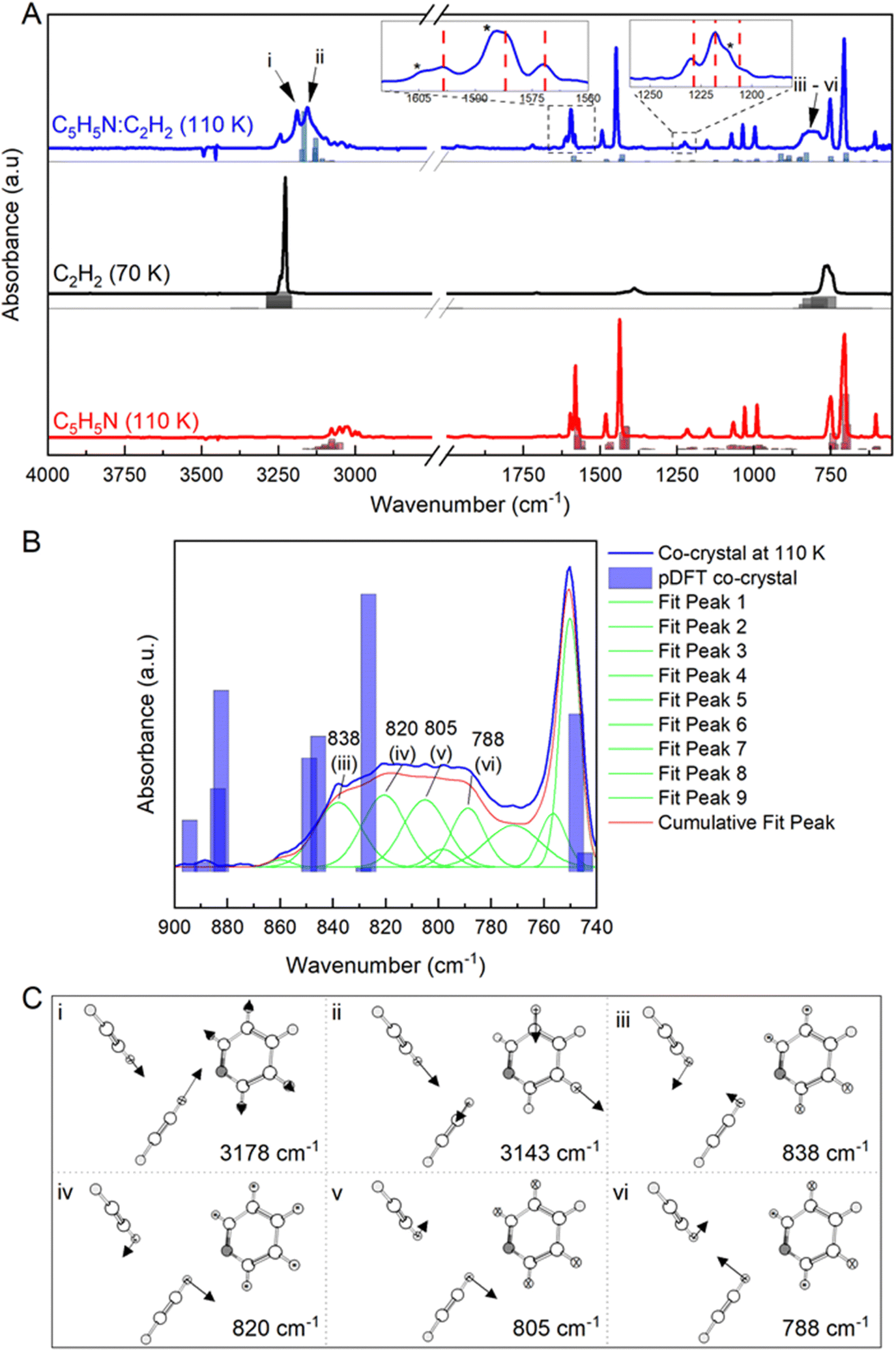 The assignments for new bands identified in the co-crystal spectrum and the corresponding p-DFT calculated eigenvectors are shown in Fig. 1(C). The two highest wavenumbers at (i) 3178 and (ii) 3143 cm−1 were found to derive from the C–H stretching modes of C5H5N and C2H2 within the co-crystal. Similarly, the modes at (iii) 838, (iv) 820, (v) 805 and (vi) 788 cm−1 all correspond to the C–H bending of these components arranged within the co-crystal.