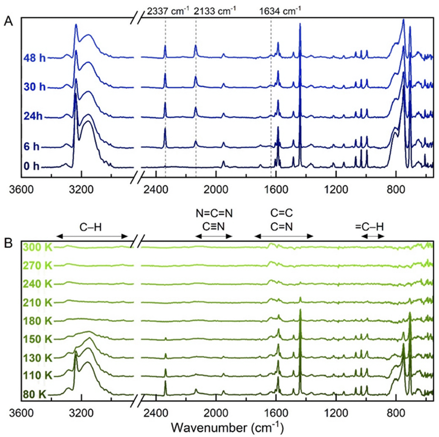 Fig. 2 Photochemical processing results after 48 hours VUV irradiation of the C5H5N and C2H2 mixed ice at 18 K. (A) IR spectra recorded after 0, 6, 24, 30 and 48 hours of irradiation. Dashed lines indicate build-up of CO2 (2337 cm−1) and CO (2133 cm−1) impurities, and of a band at 1634 cm−1. (B) IR spectra recorded during temperature ramp to 300 K. The main changes appear from 80 K onwards, with a progressive decrease in intensity for the main bands is observed to 300 K. Bands at 3290 and 2925 (C–H stretch), 1630 and 1588 (C C/C N stretches) cm−1 remain present at 300 K, indicating that refractory residues are formed. The vibrational mode regions for typical organic moieties are shown (B; top).59 | ||